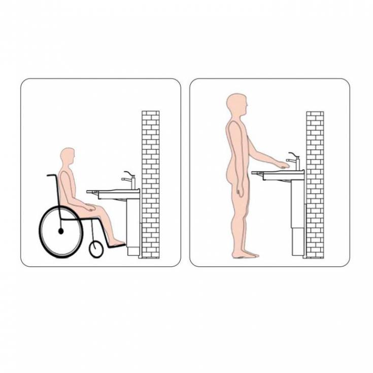 Специально разработанная раковина с регулятором высоты для инвалидов-колясочников обеспечивает удобство пользования.